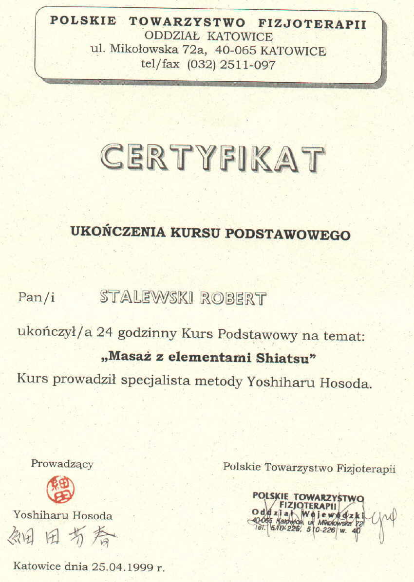 > 1999 rok - kurs Masażu Japońskiego (rodzaj japońskiej terapii manualnej poprzedzającej akupresurę) z elementami Shiatsu prowadzony przez Mistrza metody Yoshiharu Hosoda.
