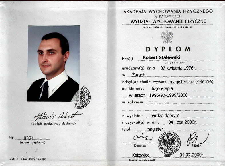 > 2000 rok - ukończone wyższe studia magisterskie kierunek Fizjoterapii na Akademii Wychowania Fizycznego w Katowicach.